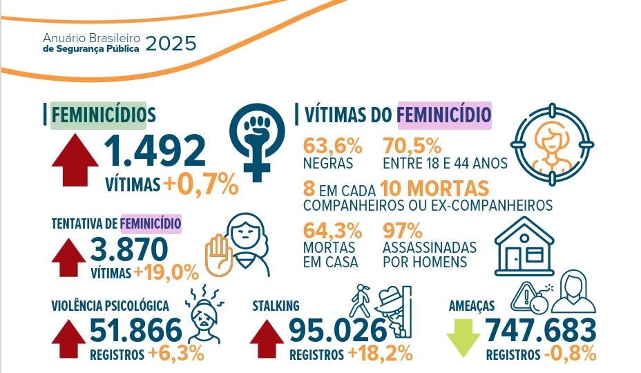 O 19º Anuário Brasileiro de Segurança Pública, divulgado este ano, aponta 1.492 vítimas de feminicídio em 2024 no Brasil, um aumento de 0,7% em relação ao ano anterior e o maior número desde 2015, quando a Lei do Feminicídio entrou em vigor.